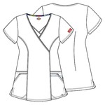 A mock wrap top with a cross-over inset features Dickies logo twill tape at the back neck and as an instrument loop inside the left patch pocket. Also featured are four front pockets, an exterior loop and stylized seams. Back darts and side vents complete the look. Center back length: 26".